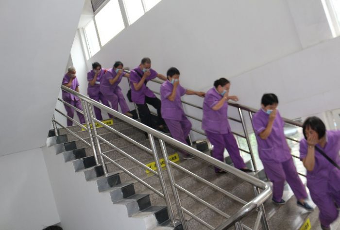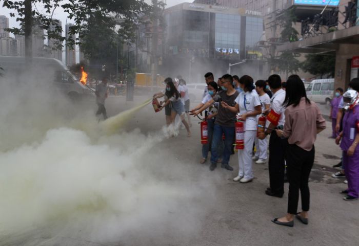 ? ? ?緊接著在周教官的指揮下,胡院和盧院的組織下進行了火災(zāi)應(yīng)急疏散演練。三樓護士站發(fā)現(xiàn)起火點,立即組織附近人員取滅火器展開第一時間撲救并向消防監(jiān)控室值班人員報告;值班人員用對講機通知巡查保安人員現(xiàn)場查看火情,并用對講機向值班人員報告情況;發(fā)現(xiàn)火勢較大,無法控制時,消防監(jiān)控室人員立即向現(xiàn)場總指揮盧院長報告,請求支援;盧院立即匯報胡院長啟動火災(zāi)應(yīng)急預(yù)案,按預(yù)案分工迅速召集各應(yīng)急小組,各組人員根據(jù)職責立即展開各項救援工作。演練中,醫(yī)生、護士、員工等都參與到演練中,各個環(huán)節(jié)有條不紊,均達到快速、準確、成功的