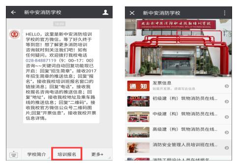 2)、進入我校微信首頁,點擊最下方菜單欄里面的“培訓(xùn)報名”,進入培訓(xùn)班報名窗口。