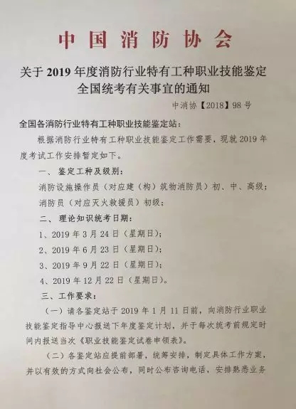? ? 現(xiàn)將中國消防協(xié)會《關(guān)于2019年度消防行業(yè)特有工種職業(yè)技能鑒定全國統(tǒng)考有關(guān)事宜的通知》轉(zhuǎn)發(fā)你們,請有參加消防行業(yè)特有工種職業(yè)培訓和鑒定統(tǒng)考的會員單位和社會有關(guān)單位,根據(jù)本單位實際情況,合理安排培訓和考試時間。