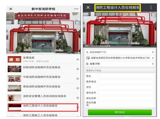 ? ? ?3)、上劃頁面,找到并點擊“消防工程設計人員在線報名”,如圖如實填寫參加培訓人員的相關信息:姓名、聯(lián)系電話、學歷、單位名稱(全稱)、單位所屬地。